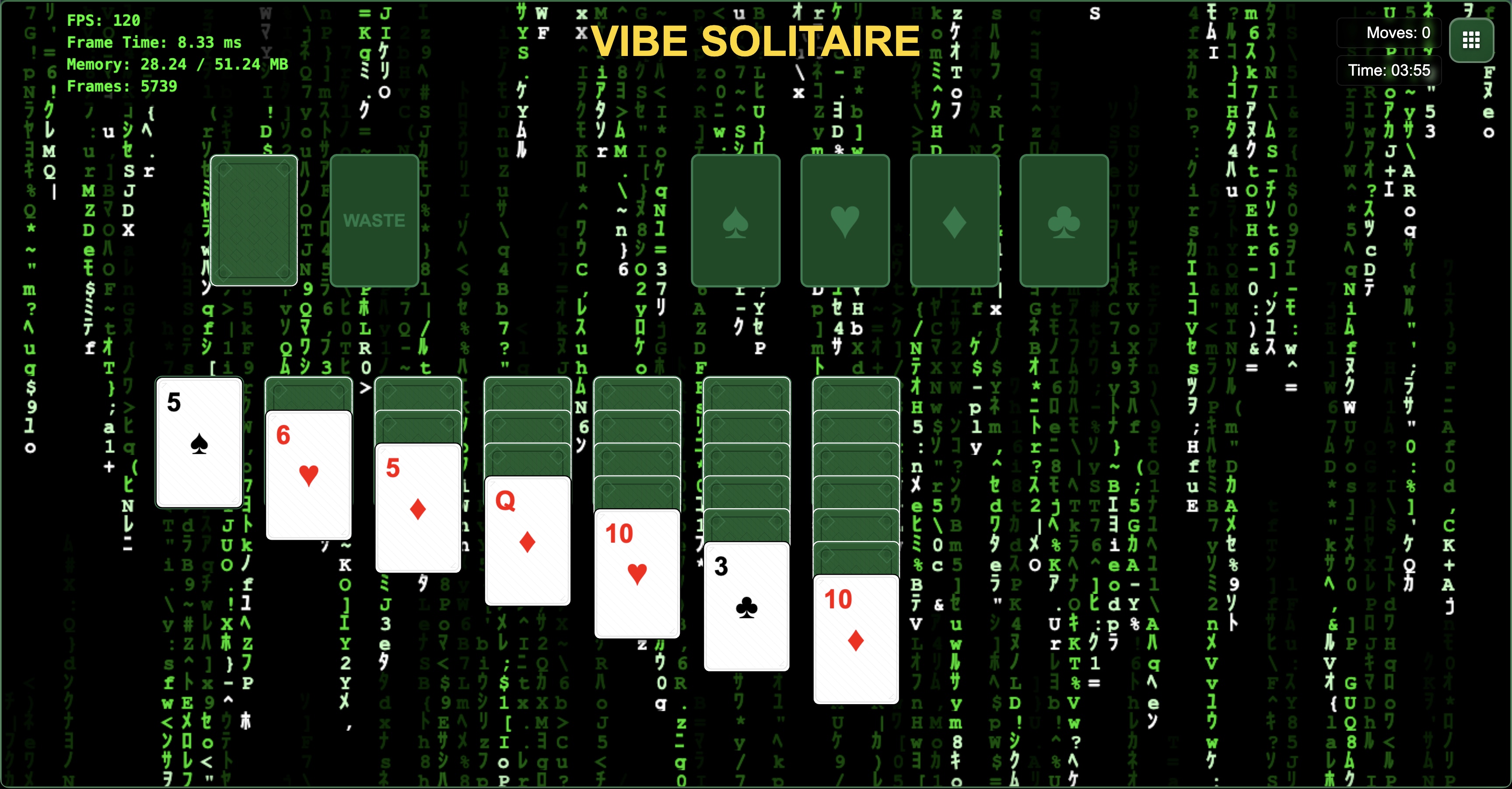 Welcome to Vibe Solitaire — a relaxing, visually hypnotic card solitaire with a cyber-matrix vibe.